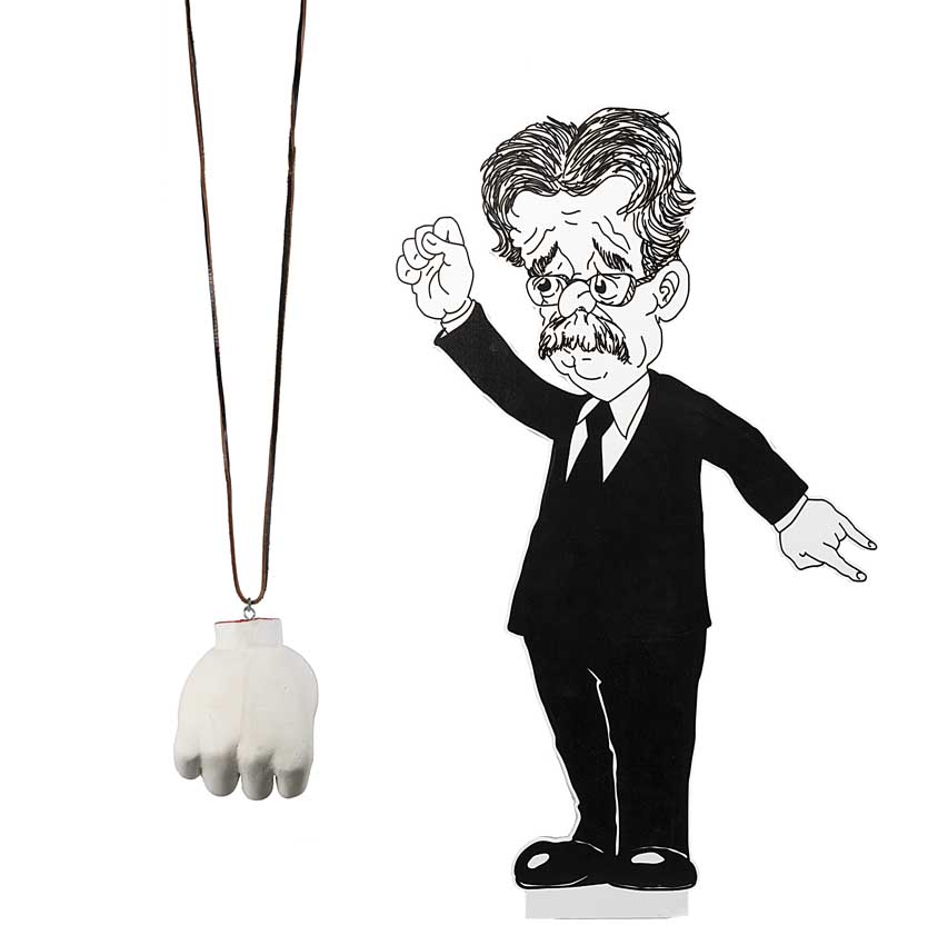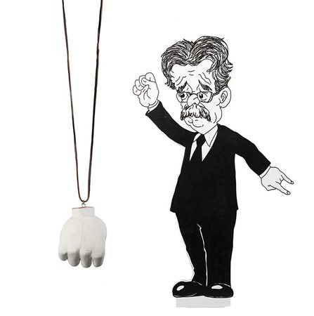 "Achille Occhetto" installazione composta da scultura raffigurante un pugno chiuso con originale a colori