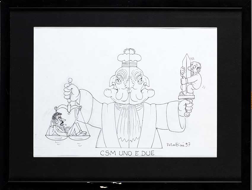 Originali "Giustizia a due pesi" personaggi vari 1997 originale pennarello su carta in bianco e nero. In cornice (cm 30x20)
