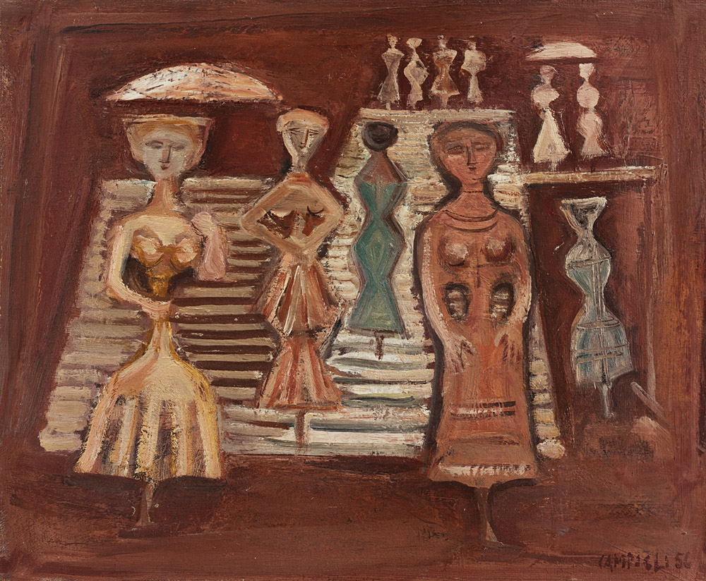 Massimo Campigli (Berlino 1895 - St. Tropez 1971) - "La Scala" 1956 olio su tela, cm 37,9x45,6 Firmato e datato 56 in basso a destra Provenienza Galleria d'Arte del Naviglio, Milano Collezione privata, Milano Opera accompagnata da certificato di autenticità su fotografia rilasciato dall'Archivio Massimo Campigli a cura di Nicola Campigli, Saint Tropez, con il n.573411325