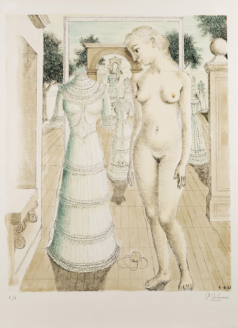 Paul Delvaux (Antheit 1897 - Furnes 1994) - "Robe de dimanche" 1967 litografia a colori, cm 63,2x51,4 Firmata in basso a destra e numerata es.E.A.