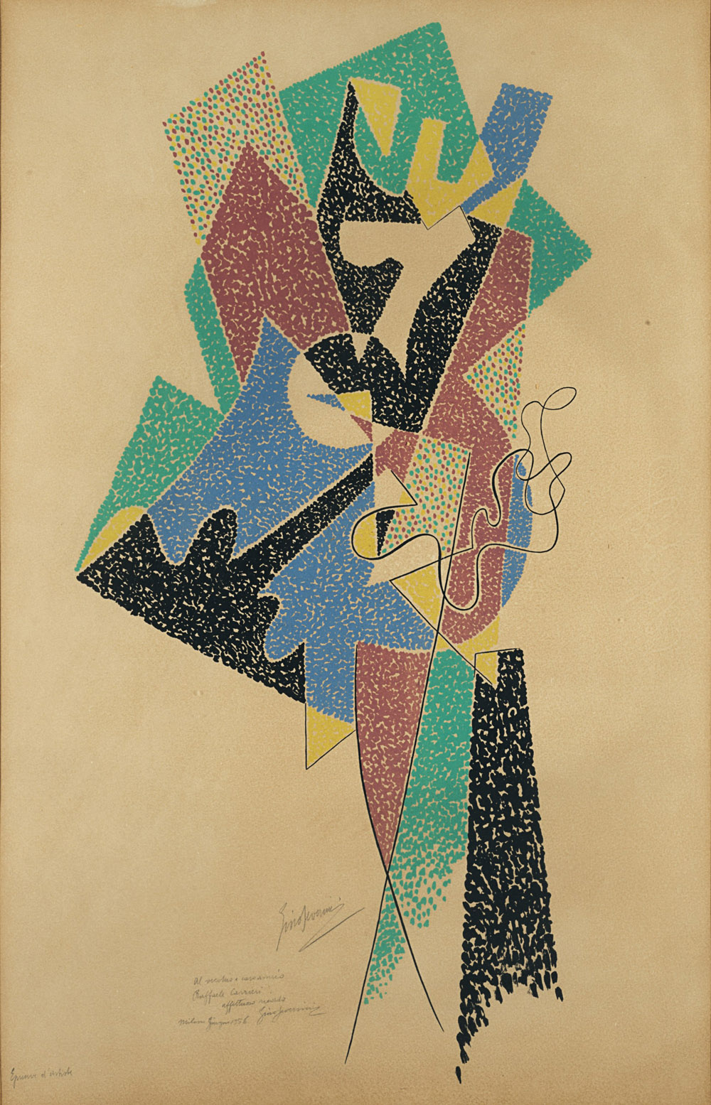 Gino Severini (Cortona 1883 - Parigi 1966) - "Senza titolo" litografia prova d'artista, cm 62x40 Firmata e dedicata a Raffaele Carrieri in basso al centro
