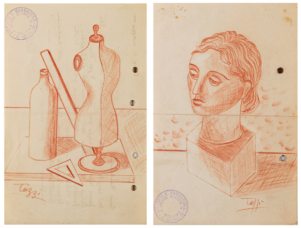 Mario Tozzi (Fossombrone 1895 - St. Jean du Gard 1979) - Coppia di disegni: "Manichino e bottiglia" 1932 sanguigna su carta, cm 21x13,3 e "Afrodite" 1930 sanguigna su carta, cm 20,2x13. Entrambi firmati. (2) Entrambe le opere sono state realizzate dall'artista a verso di una corrispondenza epistolare con Vittorio E. Barbaroux della Galleria d'Arte Milano Opere registrate presso l'Archivio Mario Tozzi, Foiano della Chiana, con il n.1098 e 1097