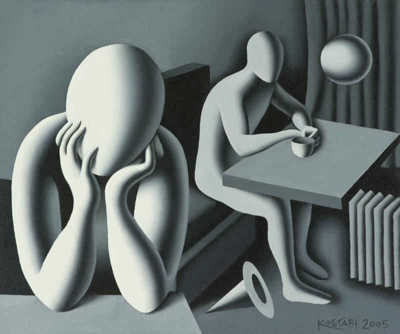 Mark Kostabi, Los Angeles 1960 - , Please don't leave me alone 2005, Olio su tela, cm. 50x60, Firma e data in basso a destra; Sul verso: firma, data e titolo., , Autentica dell'Artista su foto.