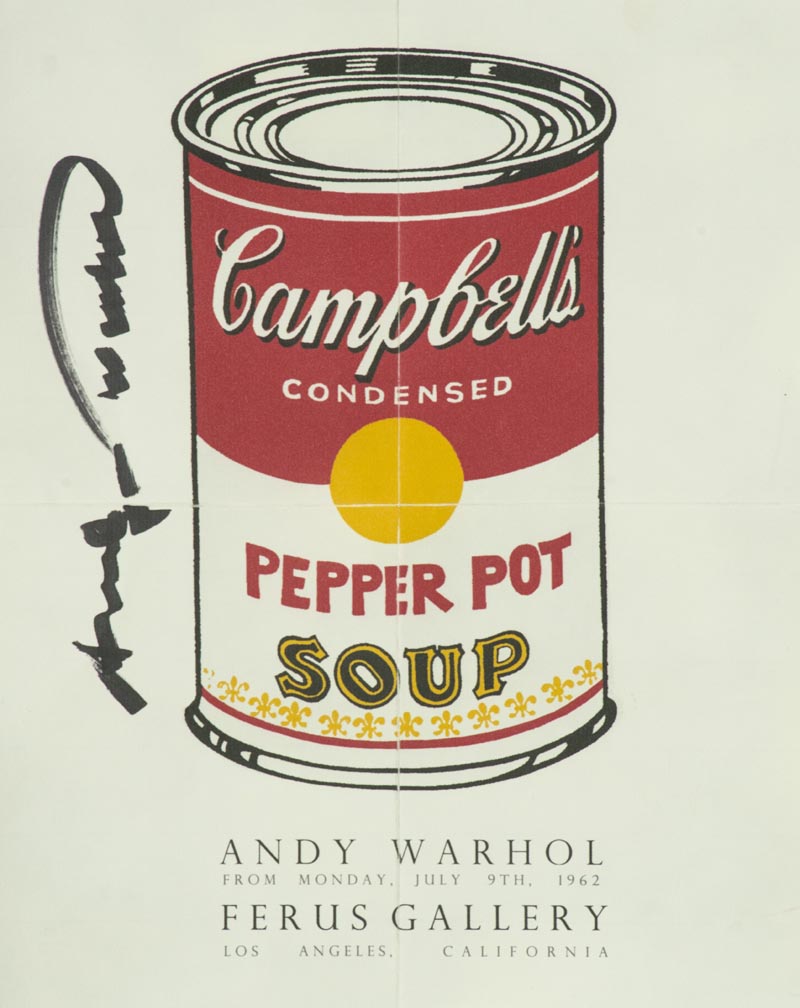 Andy Warhol, Pittsburg 1928 - New york 1987, Campbells' Soup , Cartoncino litografico offset - invito Ferus Gallery Los Angeles 1962., Firmato sul lato sinistro. L'opera presenta piegature., ,