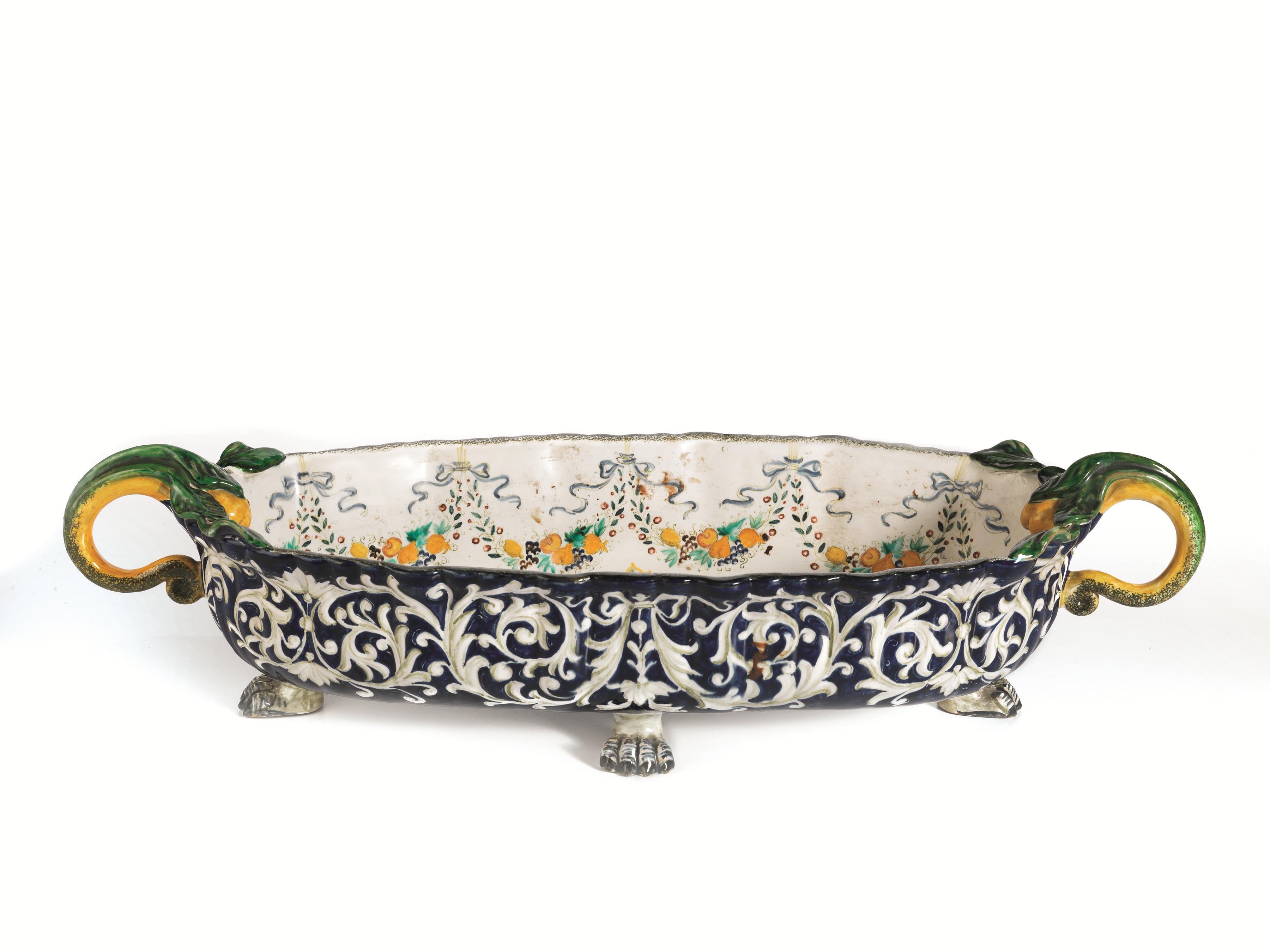 Maiolica dipinta in policromia sia all’interno che all’esterno del corpo ovale, poggiante su quattro zampe ferine.