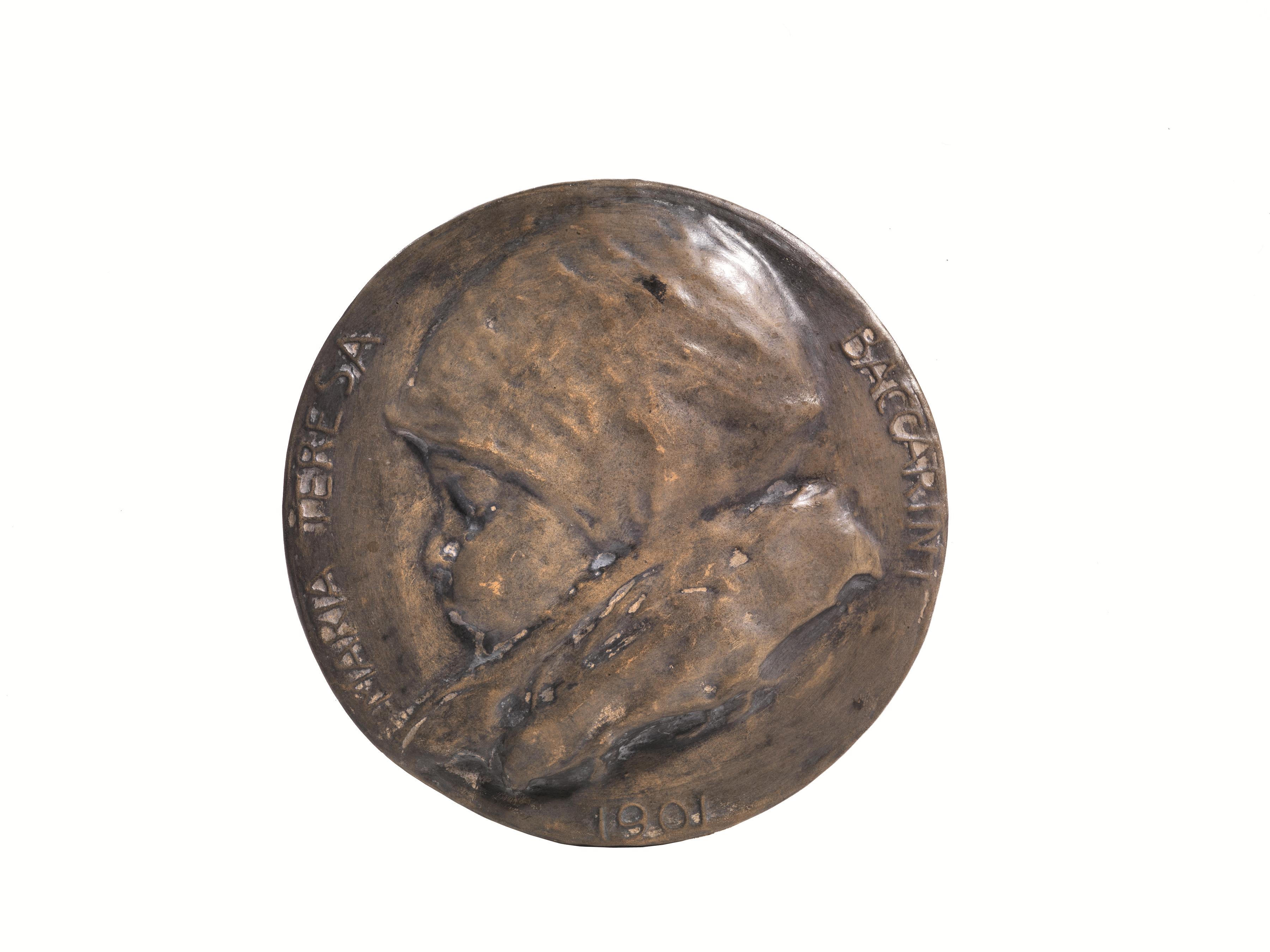Tondo in terracotta patinata, iscritto sul fronte MARIA TERESA BACCARINI 1904