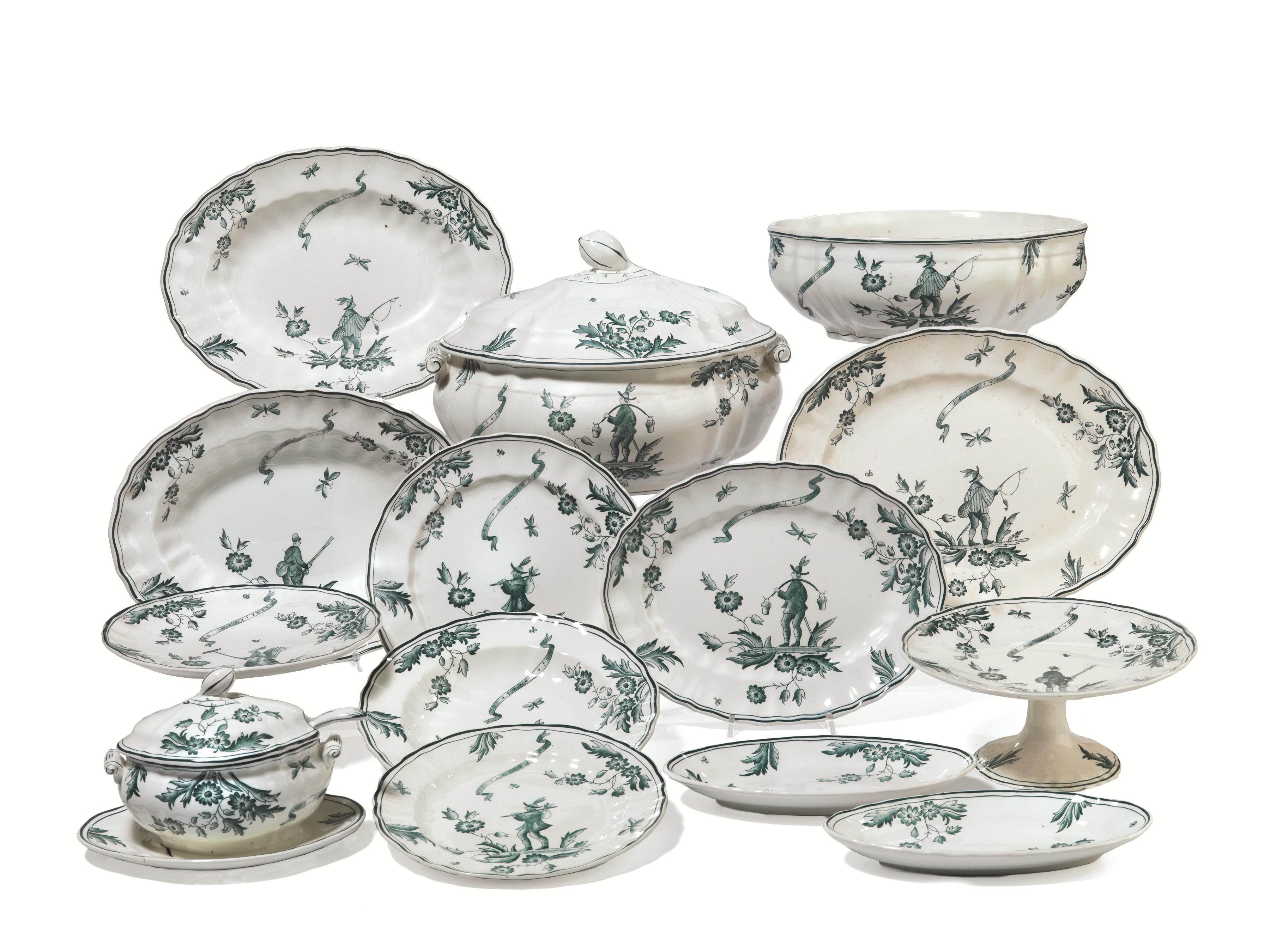 Servizio di piatti in terraglia dipinta in monocromia verde, decorata con i seguenti soggetti: il cacciatore, la mietitrice, il civettaro, il viandante, l’acquaiolo