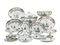 Composizione: 36 piatti piani, 12 piatti fondi, 12 piatti da frutta, zuppiera con coperchio, insalatiera ovale, coppia di alzate, coppia di vassoi fondi ovali, 6 vassoi ovali di dimensioni varie, salsiera con coperchio e cucchiaio (73)