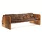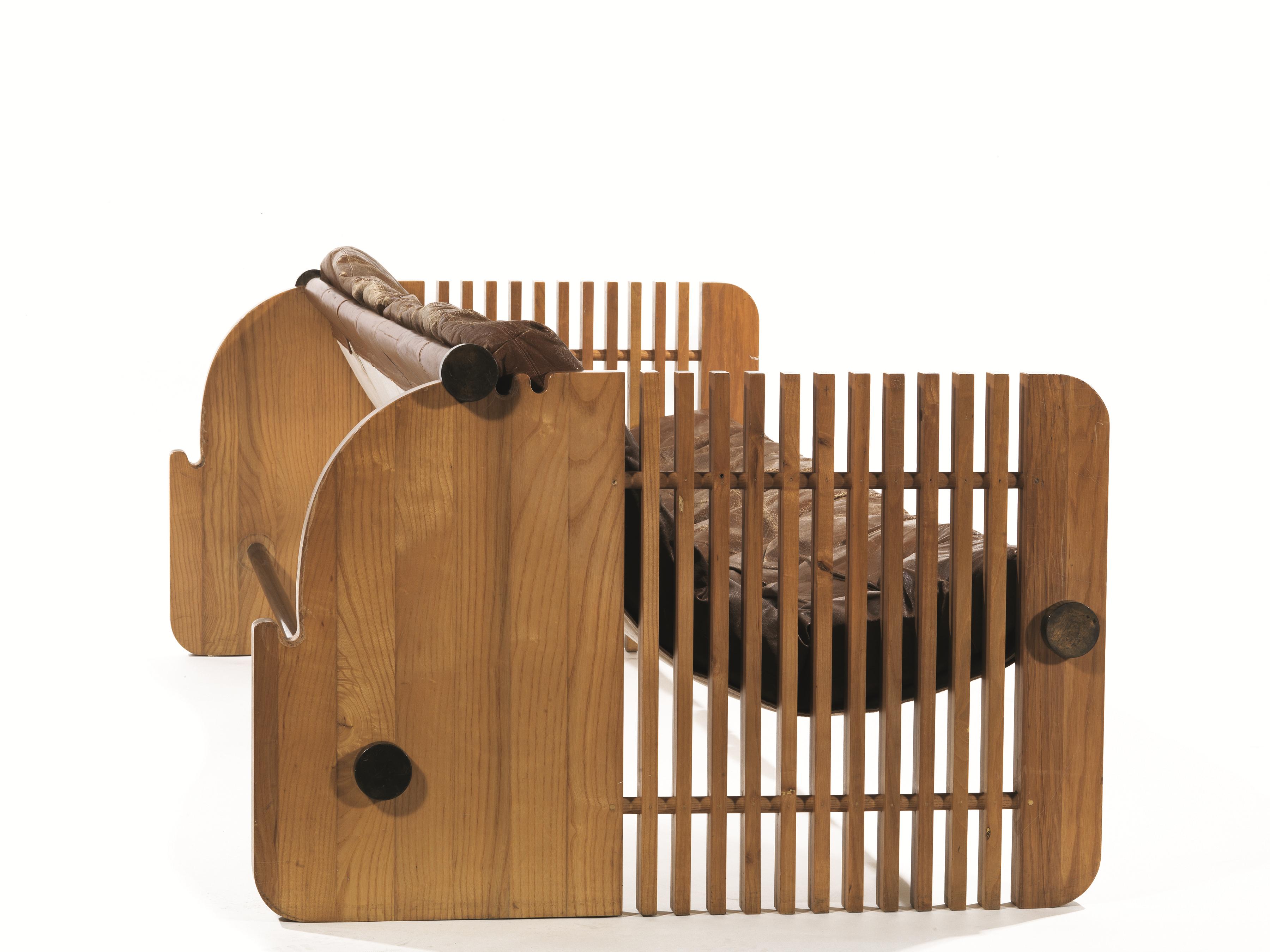 Divano con schienale reclinabile in legno, metallo cromato, pelle e tela grezza