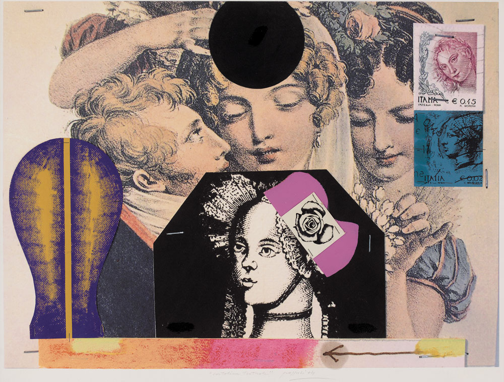 CONCETTO POZZATI Vo' Vecchio (Pd) 01/12/1935 Cartolina teatrale, 2004 tecnica mista e collage su base serigrafica su cartoncino cm. 57x76, titolo, firma e anno in alto a sinistra, opera registrata presso l'archivio Concetto Pozzati al numero 1133/6.
