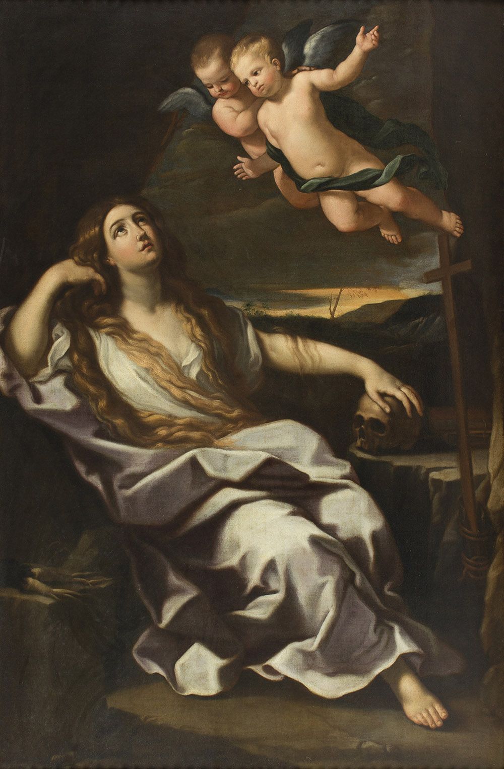 Bottega di Guido Reni Maria Maddalena nel deserto Olio su tela, cm. 230 x 150 Opera della sicura bottega del Reni, dal notissimo prototipo conservato alla Galleria Nazionale d’Arte Antica di palazzo Corsini a Roma ed eseguito dal Reni durante uno dei diversi soggiorni romani al servizio del cardinale Antonio Santacroce. Il prototipo è noto anche in una versione di buona qualità conservata nella cappella di S.Carlo presso la cattedrale di Santa Maria Assunta a Volterra, con lievi variazioni. L’imponente Maddalena reniana è forse uno dei soggetti più replicati del maestro bolognese, per le caratteristiche di pulizia formale ed equilibrio complessivo della composizione che ne fanno uno dei capisaldi del classicismo romano. In questa sede si vuole proporre una probabile partecipazione di Giovanni Andrea Sirani (noto copista del Reni) alla stesura pittorica, soprattutto in alcuni particolari del panneggio e del volto della santa, più efficaci rispetto di puttini in alto a destra.