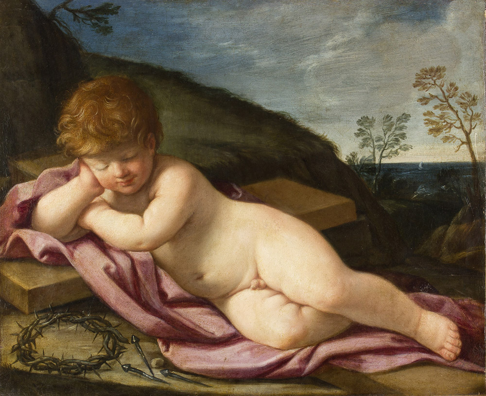 Guido Reni (Bologna, 1575 – 1642) e aiuti Cristo dormiente sulla Croce Olio su tela, cm. 62 x 76,5 Stephen Pepper, in un perizia autografa del 10 luglio 1992, attribuisce il dipinto integralmente alla mano del Reni datandolo al 1627/28. In questa sede si vuole ricondurre il dipinto ad un’autografia parziale, con il probabile apporto della bottega soprattutto nella stesura della gamba sinistra del Cristo, dei simboli della Passione (corona di spine, chiodi della croce) e del paesaggio sullo sfondo. Di buona qualità e probabilmente autografa la stesura del resto del dipinto