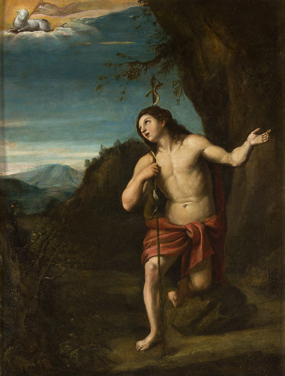 Scuola romana prima metà del Seicento Visione di San Giovanni Battista olio su rame, cm 38,7 x 29,4