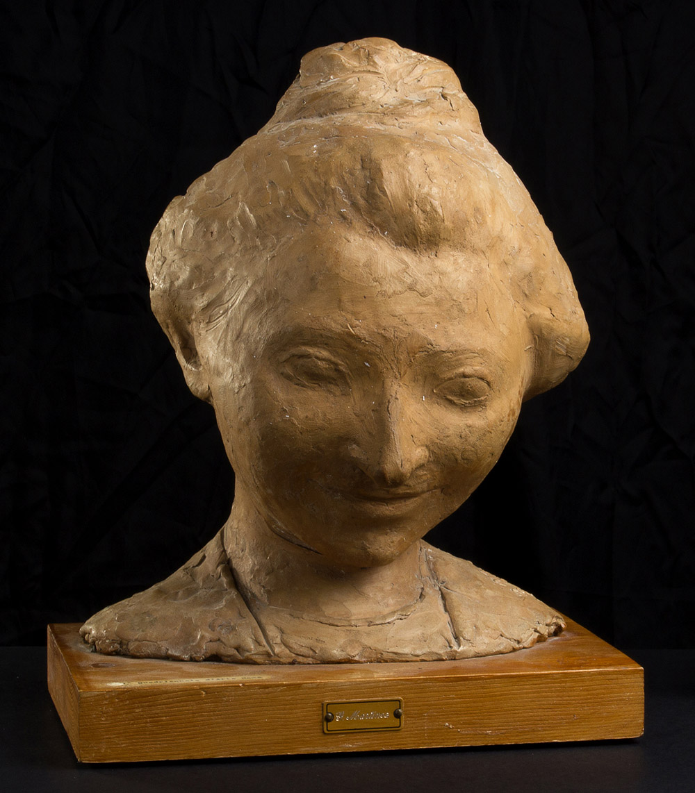 GAETANO MARTINEZ Galatina 1892 - Roma 1951 Donna arguta, 1946 Scultura in terracotta, h. cm 29,5 Firma e data sulla spalla destra: G. Martinez 46 Etichetta sotto la base: Gaetano M. Coll. Rosa Alba Martinez Villa Bartolomea Anno 1946 - n. 118 Esposizioni: Galatina 1986 Bibliografia: A. Crespi e A. Petrucci, ‘Martinez’, 1949, copertina; M. e R. Martines 1986, tav. 7; G. Gentilini e F. Riezzo, ‘Gaetano Martinez scultore’, 1999, tav. IV.44. L’opera è stata utilizzata per la copertina della monografia Martinez edita a Roma nel 1949, a cura di Attilio Crespi e Alfredo Petrucci (Istituto Grafico Tiberino, Roma).