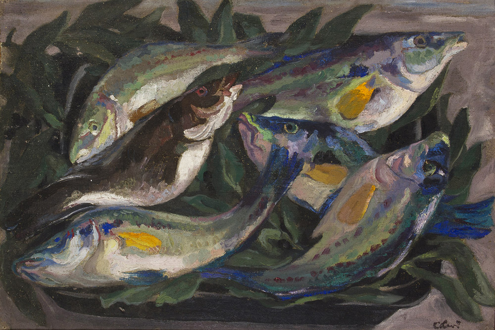 CARLO LEVI Torino 1902 – Roma 1975 Natura morta con pesci, Anni 40 Olio su...