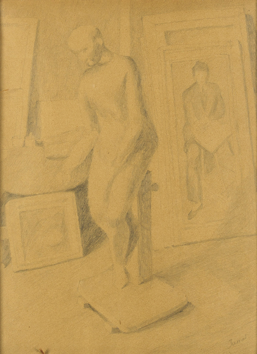 GUGLIELMO JANNI Roma 1892 - 1958 Lo studio del pittore Matita su carta cm 24 x 19 Firma in basso a destra: Janni