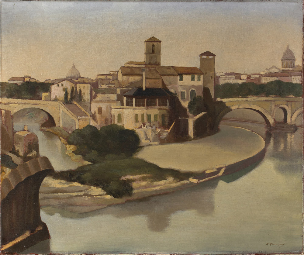 FRANCESCO TROMBADORI Siracusa 1886 – Roma 1961 Isola Tiberina Olio su tela cm 50 x 60 Firma in basso a destra: F. Trombadori Autentica su foto dell’Archivio Scuola Romana, 10 ottobre 2014