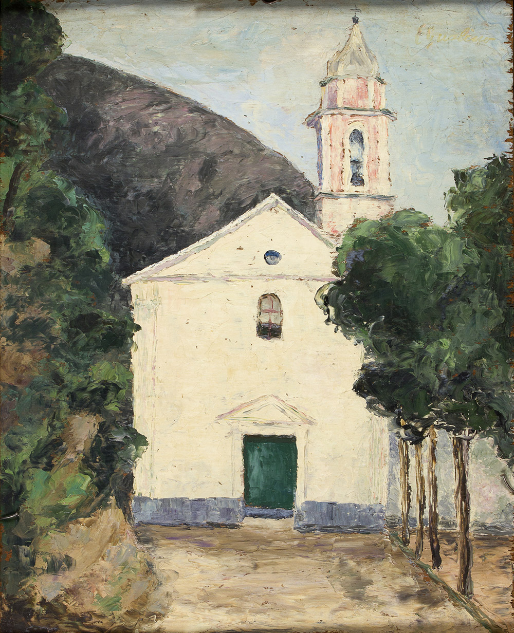 CESARINA GUALINO Casale Monferrato 1890 - Roma 1992 Casolari tra i monti/ Chiesa di paese, 1949 Olio su tavola cm 41 x 53 Firma e data in alto a destra: C Gualino 49 Firma al retro in alto a destra: C Gualino