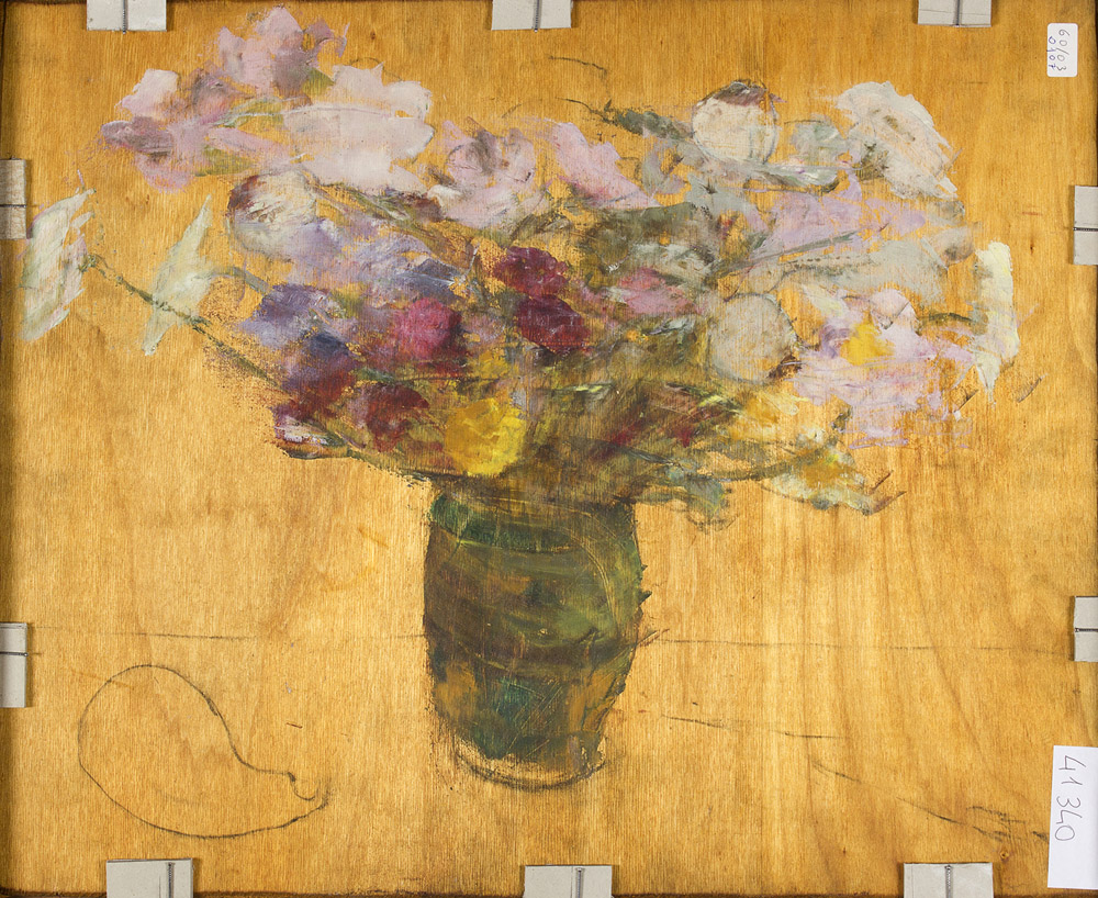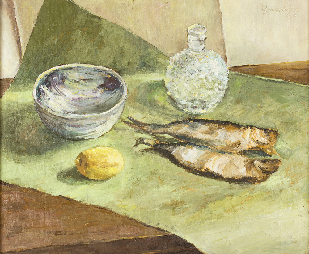 CESARINA GUALINO Casale Monferrato 1890 - Roma 1992 Natura morta con pesci e limoni, 1960 Olio su tavola cm 45 x 55 Firma e data in alto a destra: C Gualino 60 Al retro bozzetto con vaso di fiori