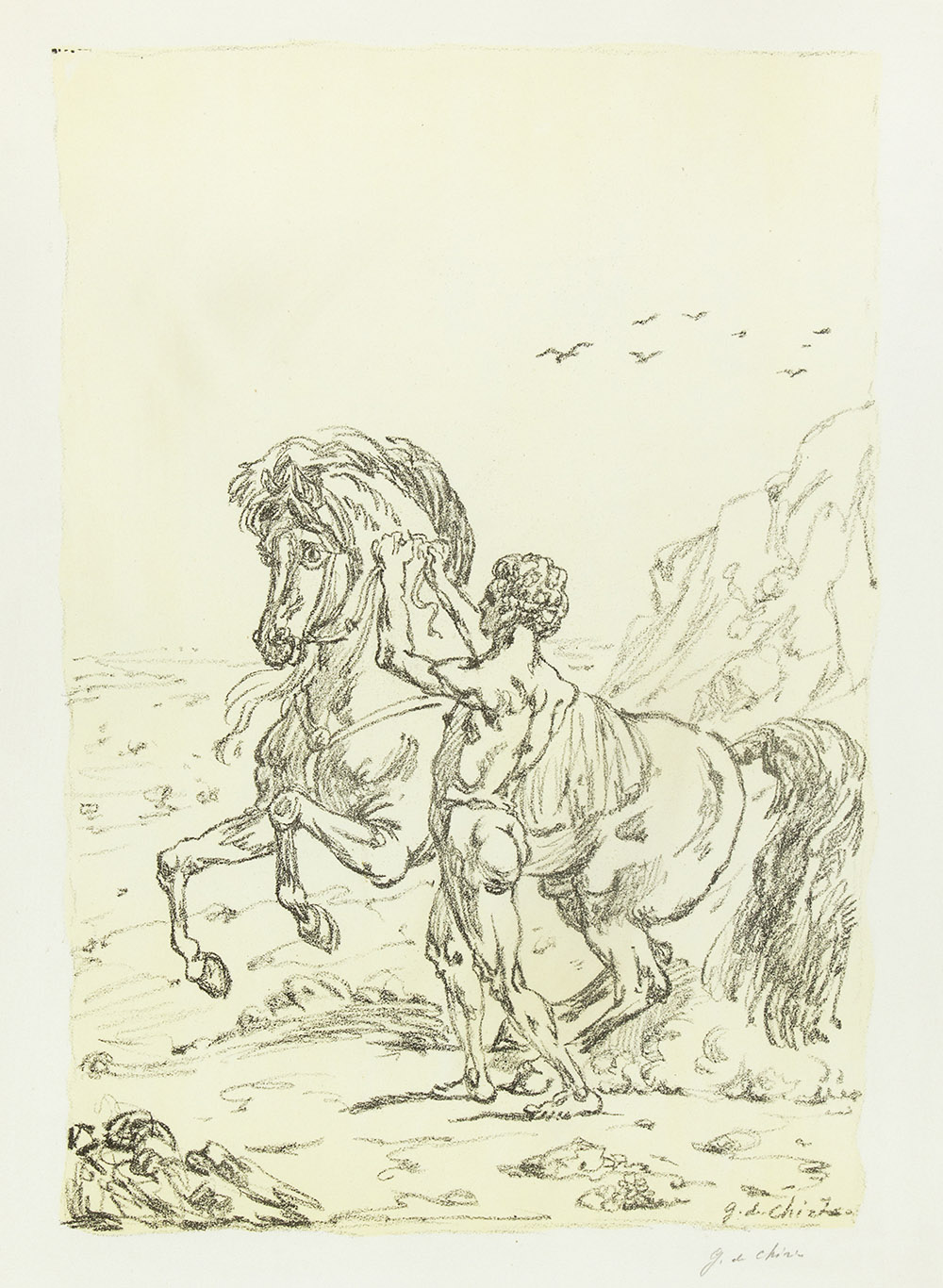 GIORGIO DE CHIRICO Volo 1888 – Roma 1978 I cavalli Litografia, tiratura limitata a 121 esemplari Misura del foglio cm 64 x 47 circa Firma in basso a destra: G. de Chirico Etichette al retro della XXIV Biennale Internazionale d’Arte di Venezia del 1948 n. 1196 - Cartella editore Carlo Bestetti, e della Collezione dell’Obelisco Collezione Quinti ed Eredi