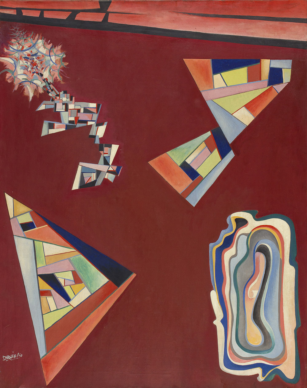 PIERO DORAZIO Roma 1927 – Perugia 2005 Sincreto organico, 1950 Olio su tela cm 92 x 73 Firma e data in basso a sinistra: DORAZIO 50 Firma, titolo e data al retro: PIERO DORAZIO “SINCRETO ORGANICO” 16/23/1950 Collezione Quinti ed Eredi