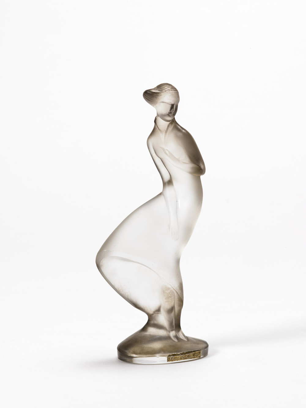Ida Schwetz-Lehmann - "Ragazza nel vento" scultura in vetro ambrato pressato in stampo e molato. Cecoslovacchia 1937. Manifattura Curt Schlevogt (h cm 22)