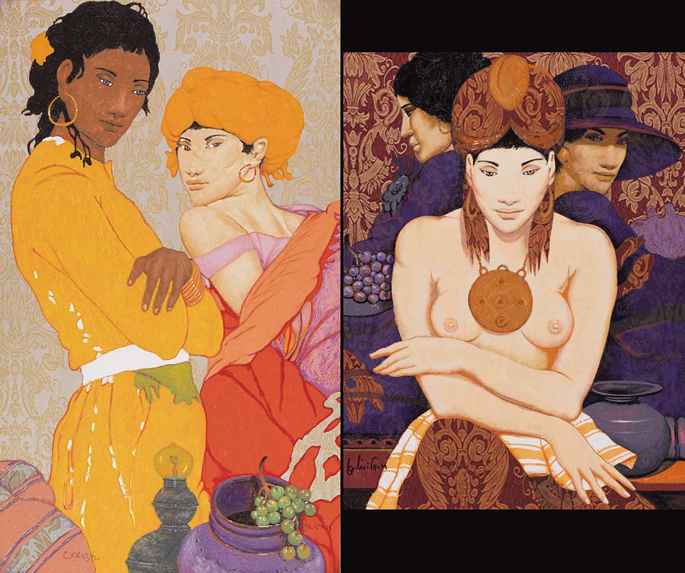 GOFFREDO CIVITARESE Chieti 30/01/1938 Figure con natura morta serigrafia polimaterica su stoffa damascata cm. 80x60, esemplare LXXXIII/C, firma in basso a sinistra, etichetta della Galleria d'Arte Nuovo Segno al retro. Figure con natura morta serigrafia polimaterica su stoffa damascata cm. 100x60, esemplare CXXVII/CL, firma in basso a destra, etichetta della Galleria d'Arte Nuovo Segno al retro.