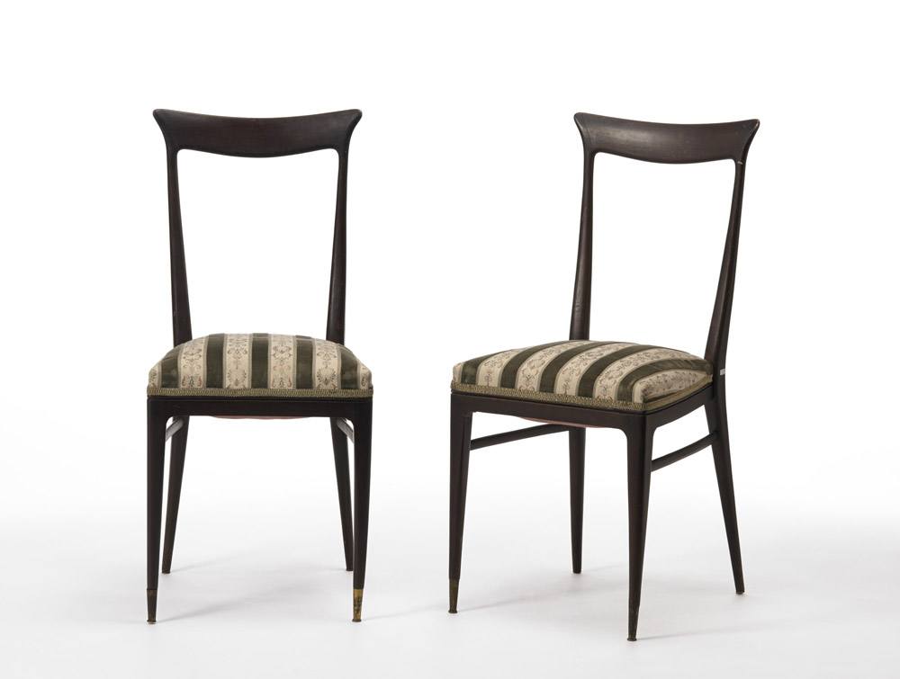 Guglielmo Ulrich (Milano 1904 - 1977) - (attribuito) - Coppia di sedie in legno con gambe rastremate e puntali anteriori in ottone, seduta imbottite e schienale a giorno. Italia, fine anni '50 (difetti)