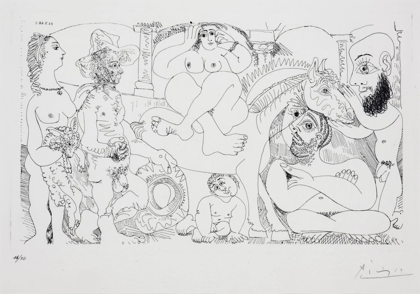 PICASSO PABLO (E 1881 - 1973 F) - "Figure" 1968, 29,6x51,5 acquaforte (foglio 45,5x64) es. 16/50. Opera firmata in basso a destra e numerata in basso a sinistra. Bibl.: G. Bloch, Picasso. Catalogue de l'oeuvre gravé et lithographié 1966-1969, Tomme II, publ b/n con il n. 1483; G. Soavi, Picasso 347 immagini erotiche, Milano 1982