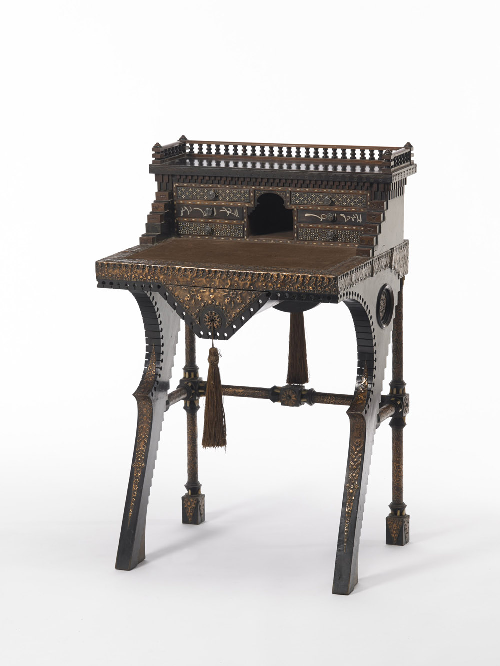 Carlo Bugatti (Milano 1856 - Molsheim 1940) - Scrittoio modello "248" dotato di sei cassettini e cassetto centrale. Struttura architettonica orientaleggiante, decorata con intarsi calligrafici metallici e geometrici di gusto moresco in metallo e osso, applicazioni in rame sbalzato, frange di seta. Pomelli dei cassetti realizzati con monete antiche. Piano rivestito in velluto non originale. Milano primi anni 90 del sec. XIX (cm 62x97x48) (lievi difetti e piccole mancanze) Provenienza: collezione privata, Roma Bibliografia: Catalogo di vendita Bugatti, mod. 248