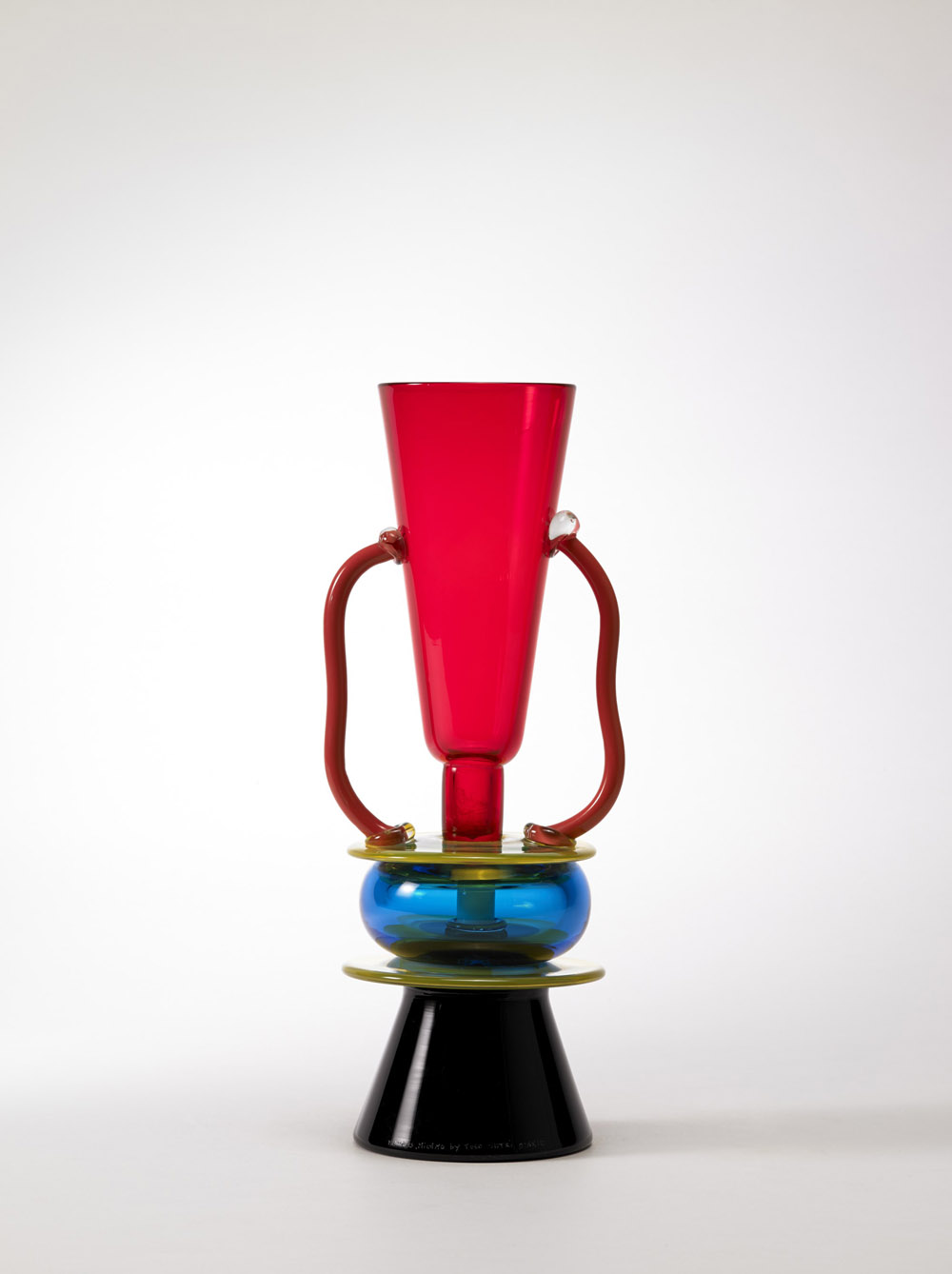 Ettore Sottsass (Innsbruck 1917 - Milano 2007) - Vaso "Sirio", manifattura Toso vetri d'arte per Memphis Milano, 1982. Vetro soffiato ad incalmo con applicazioni. Colori nero, giallo, azzurro, rosso e arancio. Firmato a punta alla base. (h cm 36)