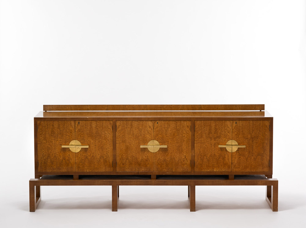 Studio Attilio e Giuseppe Terragni, Como (attribuito) Controbuffet a sei ante. Impiallacciato in legno di tamos, profili in teak e interno in mogano cuba. Grandi maniglie a disco in ottone. Esecuzione Meroni & Fossati, Lissone 1937 (cm 235x90x50) (segni d’uso) Provenienza: Villa Comi Bianchi, Como