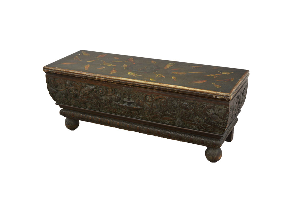 Ettore Zaccari (1877 - 1922) - Cassapanca in legno decorata ad intaglio con parte superiore laccata, decorata con figure di volatili e motivi geometrici piedi anteriori a sfera (cm 129x50x46) Sec. XX (difetti) Bibliografia per mobili simili: G. Marangoni, Enciclopedia delle moderne arti decorative italiane, Ceschina Milano, 1925, vol. 1 Il mobile contemporaneo, tavv. 4, 5, 31, 79, 80, 81, 99.