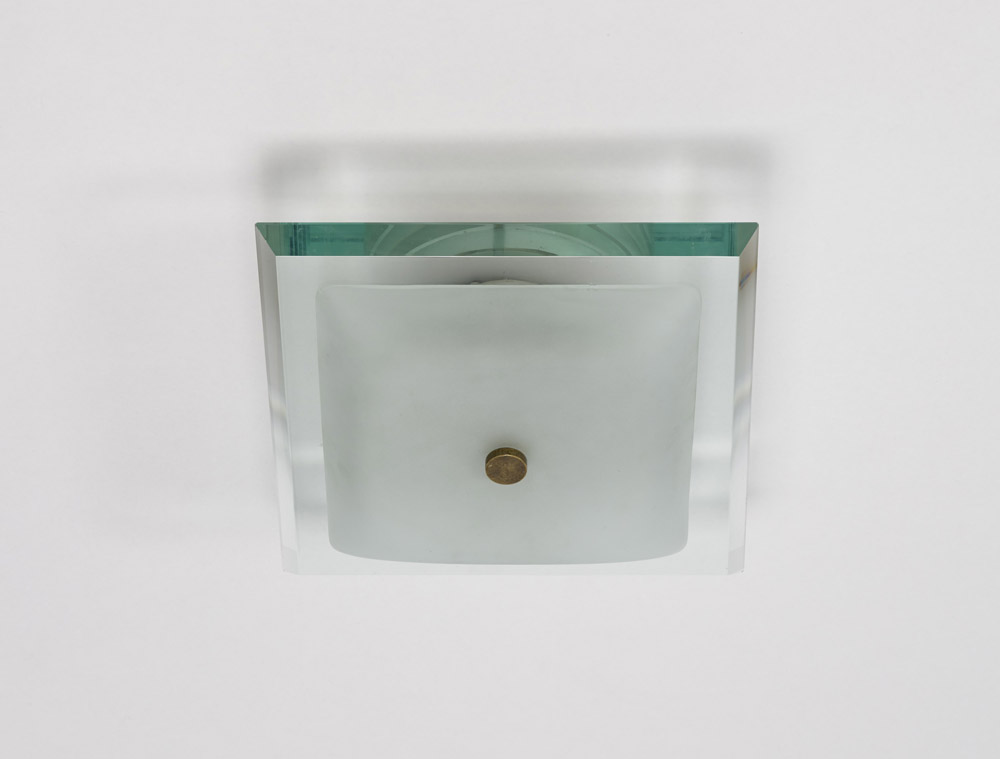 Fontana Arte Lampada a plafone modello "1990", Milano 1962 Cristallo satinato, cristallo molato di forte spessore, alluminio laccato bianco e ottone (cm 35x15x35) (lievi difetti)