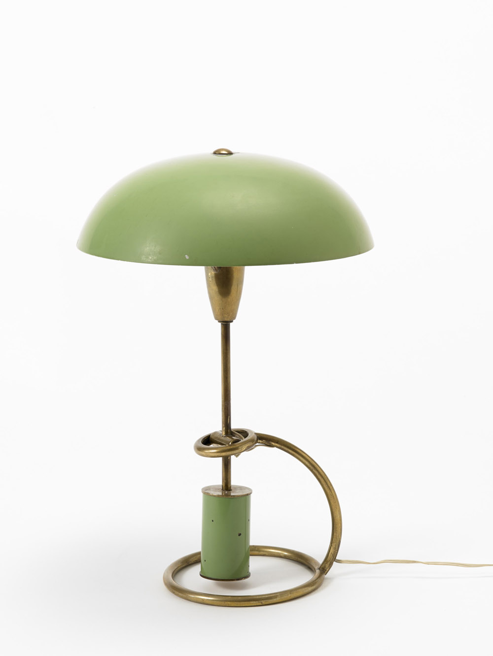 Angelo Lelii (1911 - 1979) - Lampada da tavolo orientabile a bilanciere. Produzione Arredoluce, Monza, anni 50. Struttura in ottone e alluminio laccato verde. Marchio "AL" incusso sotto la base del bilanciere. Etichetta del rivenditore presente sotto il paralume. (h max cm 37) (lievi difetti) Bibliografia: "Domus", n. 261, agosto 1951, p. 32