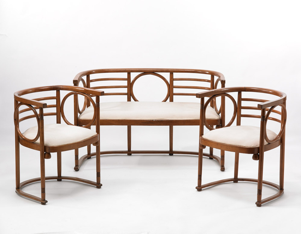 Josef Hoffmann (1870 - 1956) - Salottino in faggio curvato composto da un divanetto e due poltroncine. Produzione Jakob e Josef Khon, Vienna, inizi del sec XX (cm 128x75x54; cm 55x75x54) (restaurato)