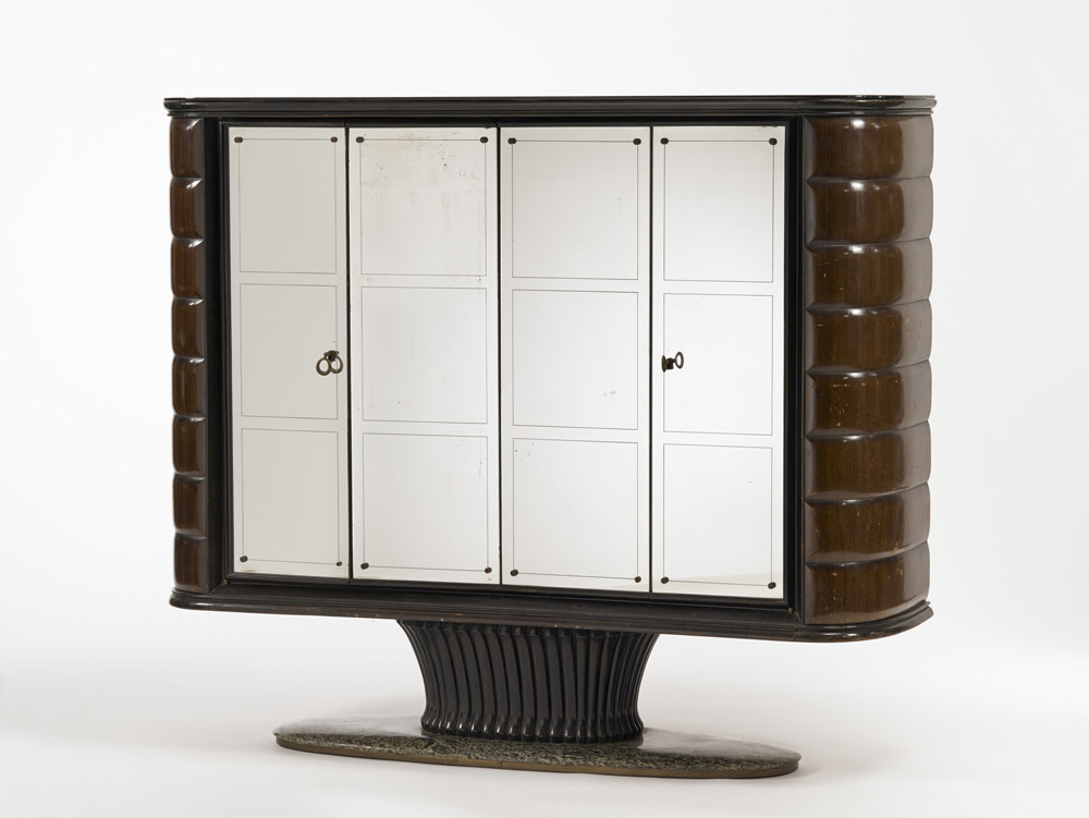 Osvaldo Borsani (1911 - 1985) - (attribuito) Mobile bar impiallacciato in palissandro indiano, con base ovoidale in marmo verde delle alpi, fronte con ante a soffietto rivestite da specchi, interno in acero e cristallo molato, fianchi costolati, piano superiore in cristallo. Italia, anni 30/40. (cm 157x132x42) (lievi difetti)