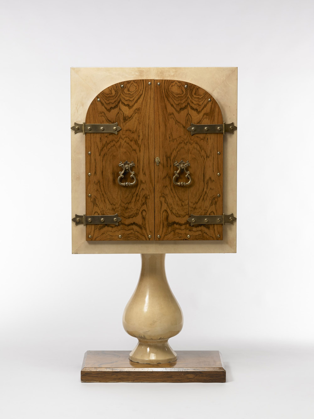 Giorgio Tura - Mobile bar modello "1208". Produzione Tura, Milano anni 70. Legno rivestito in pergamena verniciata al poliestere, guarnizioni e borchie in metallo nichelato, interno illuminabile con ripiani in vetro e specchi della manifattura CB Seveso. Dopo la morte del padre Aldo, Giorgio Tura proseguì l'attività con il marchio "Tura" (cm 80x154x44) (lievi difetti) Bibliografia: Tura - catalogo generale, n. 1208