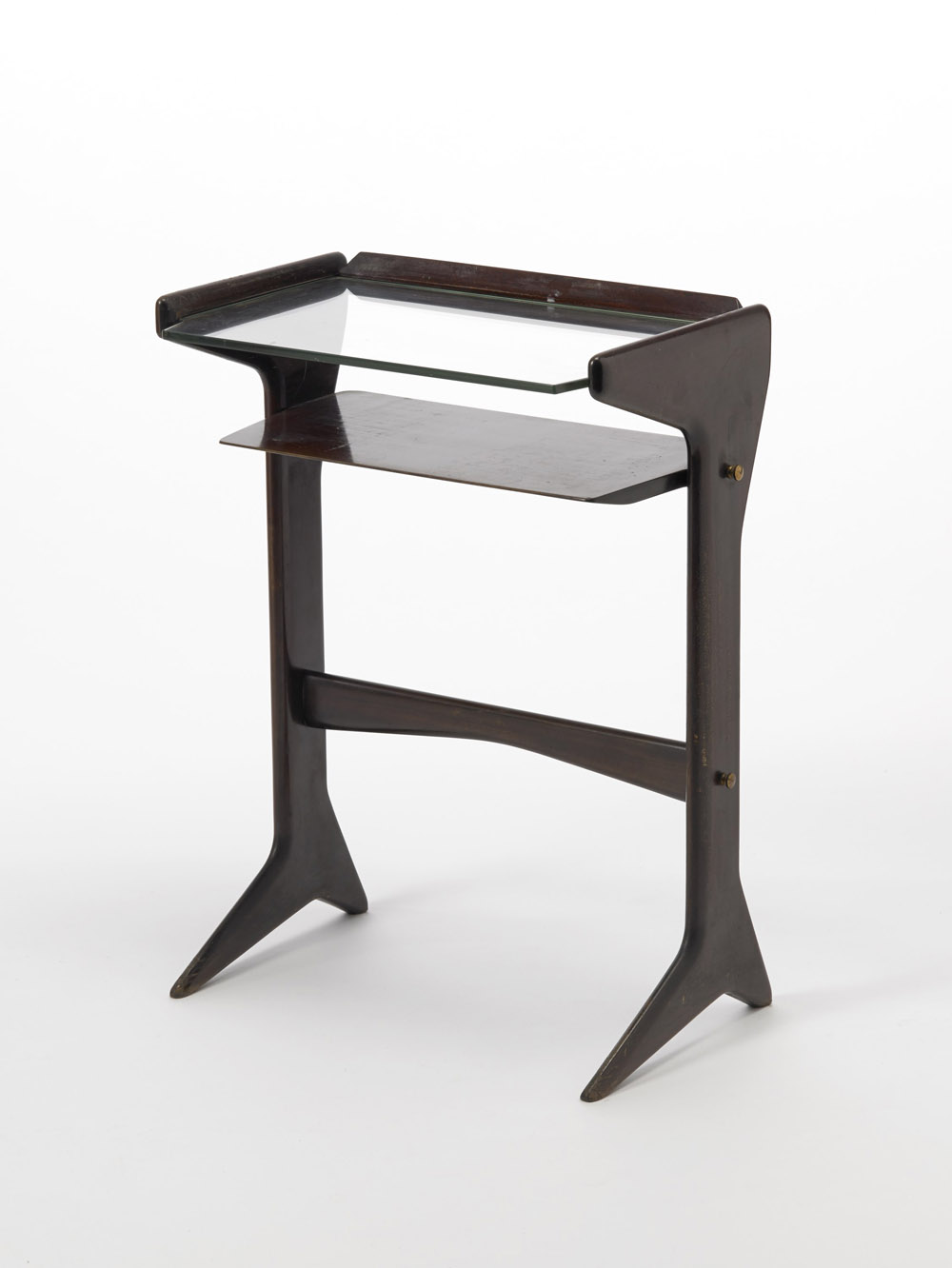 Ico Parisi (Palermo 1916 - Como 1996) - Mobiletto portatelefono in mogano intagliato, ottone e cristallo molato. Produzione De Baggis, 1954 (cm 45x62x29) (lievi difetti, mancanze) Modello in corso di archiviazione (n. provvisorio 1954.DB2) Archivio del Design di Ico Parisi, Como.