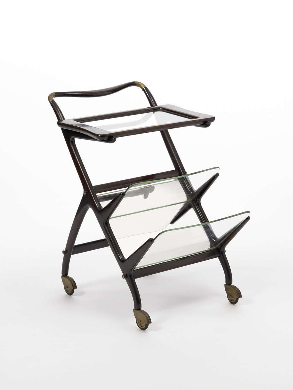 Ico Parisi (Palermo 1916 - Como 1996) - Carrello portariviste in ebano con ripiani in vetro e guarnizioni in ottone. Produzione De Baggis, anni 50. (cm 46xh66x63) Bibliografia: Modello in corso di archiviazione (n. provvisorio 1952.DB1C). Archivio del Design di Ico Parisi, Como