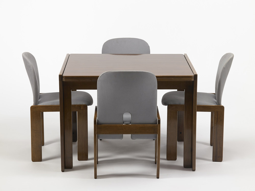Afra e Tobia Scarpa - Lotto composto da un tavolo in legno di palissandro indiano modello "778" e quattro sedie modello "121". Produzione Cassina, Milano 1965. Piano impiallacciato in palissandro indiano, struttura in massello di noce, sedute e schienali rivestiti in tessuto azzurro. (cm 100x73x100/200) (lievi difetti) Bibliografia: G. Gramigna, Repertorio del design italiano 1950-2000 per l'arredamento domestico, Vol I, Allemandi, Torino 2003, p. 117.