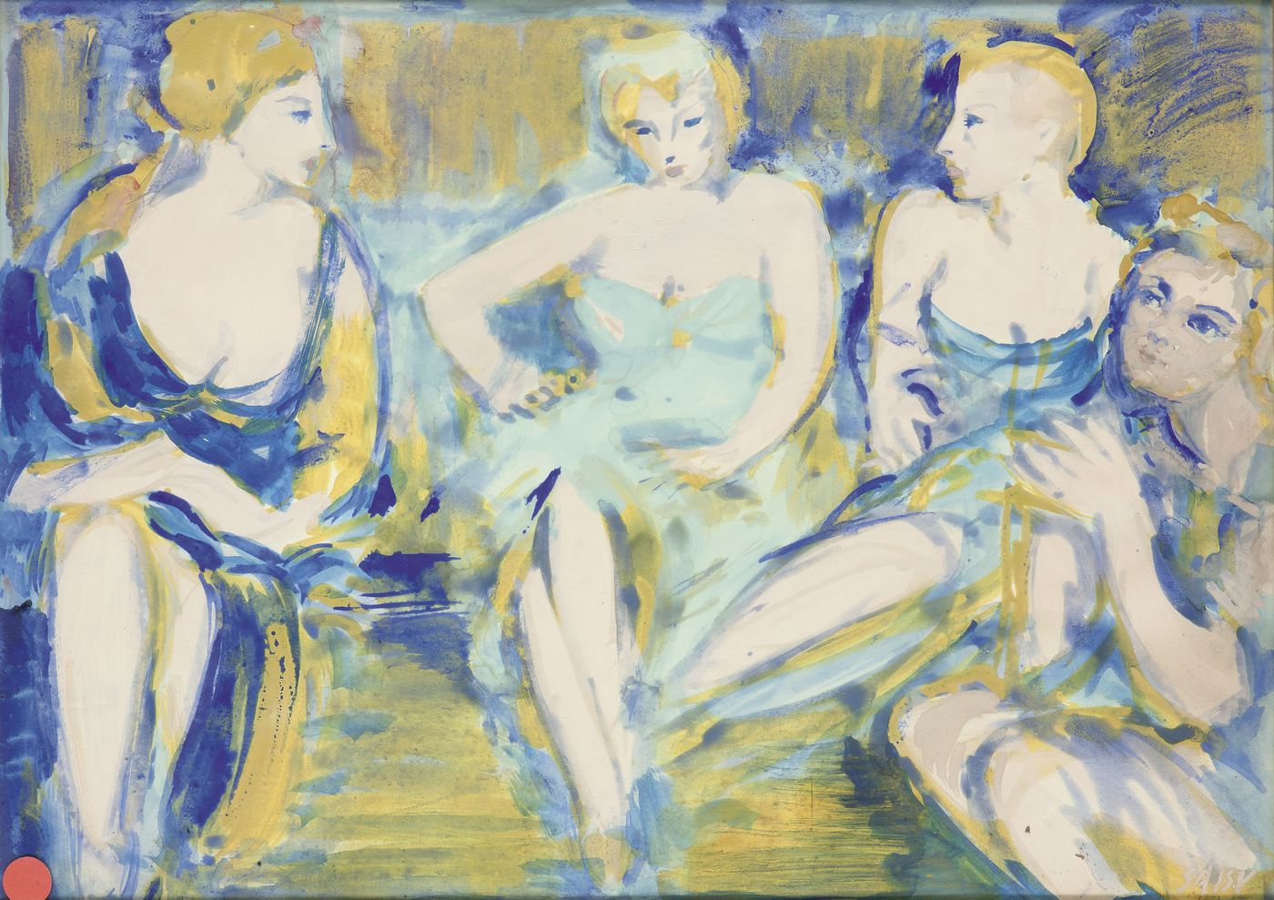 SASSU ALIGI (Milano 1912 – 2000) - "Conversazioni femminili", 35x49 tecnica mista su carta. Opera firmata in basso a destra. Già Galleria d'Arte "Piemonte Artistico e Culturale", Torino (timbro al retro)