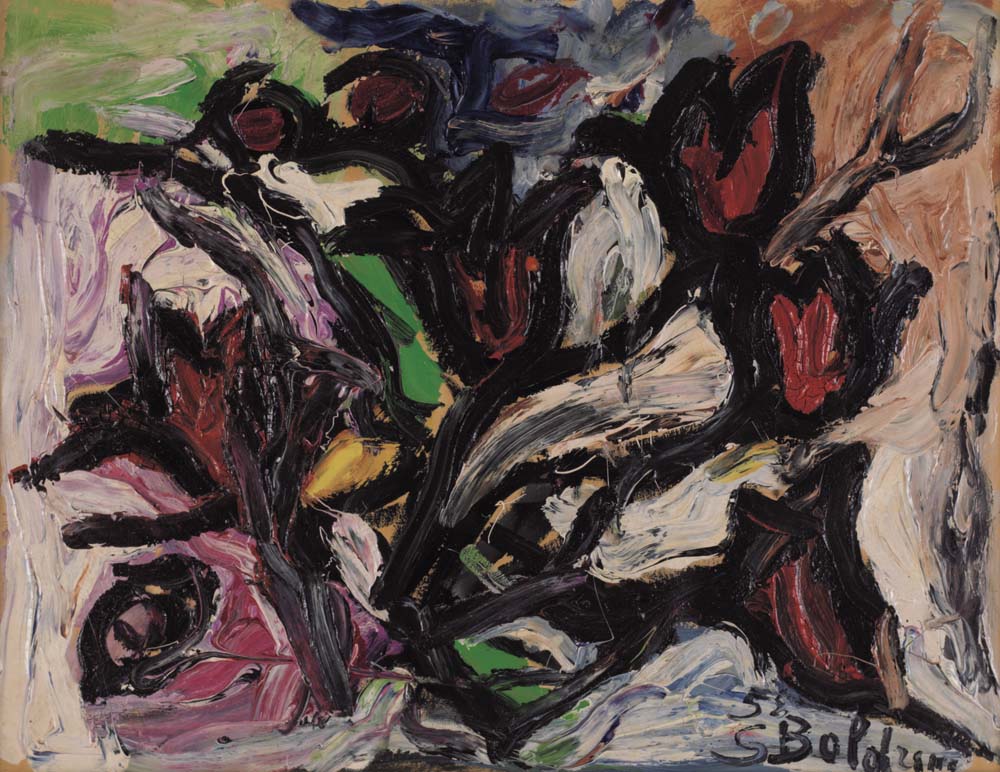 GUSTAVO BOLDRINI Venezia 1925 - 1988 Fiori, 1958 olio su cartone cm. 43x56, firma e anno in basso a destra.