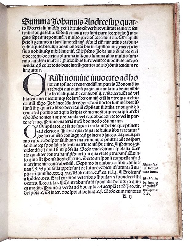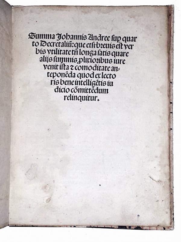 Very scarce early edition a founding text of medieval marriage law: the «summa» by Giovanni D'Andrea, the standard handbook on this topic for more than two centuries.