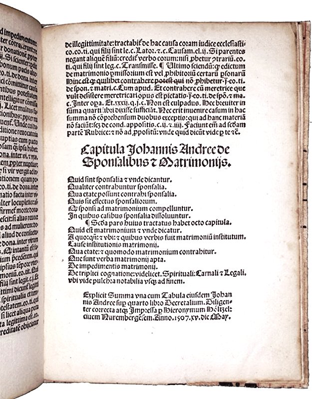D'Andrea, Giovanni.Summa Johannis Andree sup[er] quarto Decretaliu[m]: que etsi breuis est verbis vtilitate t[ame]n longa satis quare alijs summis p[ro]lixioribus iure venit ista [et] comoditate antepone[n]da quod ex lectoris bene intellige[n]tis iudicio co[m]mitte[n]dum relinquitur.[Nuremberg: Impressa p[er] Hieronymum Holtzel ciuem Nuremberge[n]sem, anno 1507 xv. die May.]
