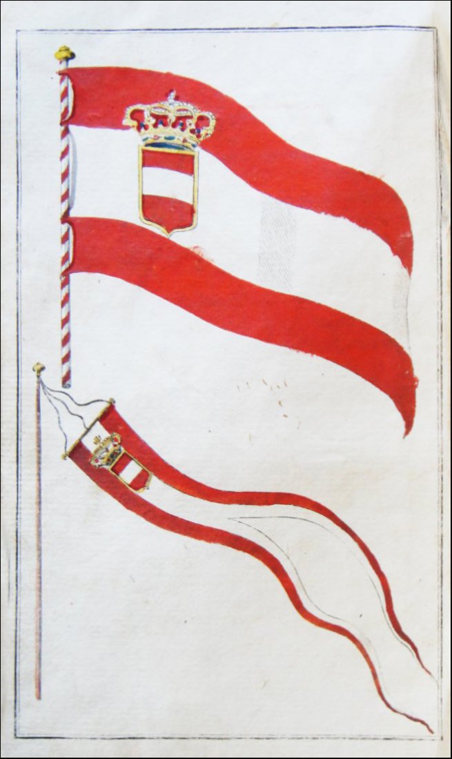 8vo, marbled paperboard binding; pp. [4], 204, with a plate at frontispiece containing flags with coats of arms of the the Merchant Navy of Austria, hand-colored in red. Engraving at title-page with a crowned double headed Austrian imperial eagle.