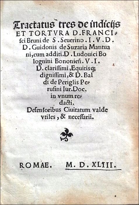 Bruni, Francesco (and others).Tractatus tres de indicijs et tortvra d. Francisci Bruni ... d. Guidonis de Suzaria ... cum additi d. Ludouici Bolognini ... & d. Baldi de Periglis ... in vnum redactiRomae [apud d. Hieronymam de Cartulariis, sumptibus Michaelis Tramezini] 1543.
