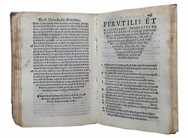 Scarce and important collection of law treatises on torture: besides Bruni's work, there are the treaties of Baldo de Perigli, Lodovico Bolognini and Guido de Suzaria.