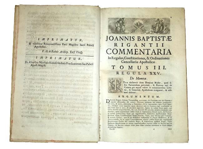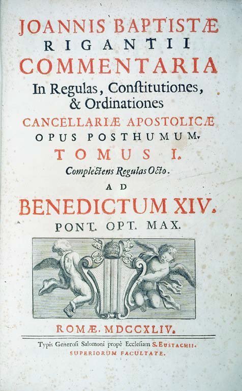Rigantius, Johannes Baptista. Joannis Baptistae Rigantii Commentaria in regulas, constitutiones, & ordinationes Cancellariae Apostolicae opus posthumum. Tomus I [-IV]. Romae, typis Generosi Salomoni prope Ecclesiam S. Eustachii, 1744-1747.