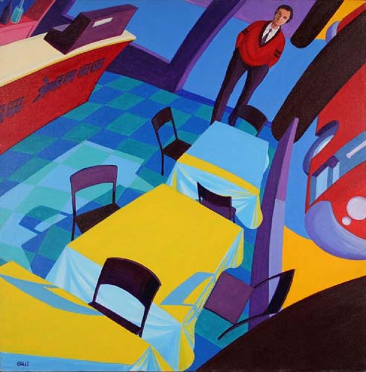 STEFANO GALLI Falconara Marittima (An) 20/11/1950 Bar Stazione 3, 2001 acrilici su tela cm. 60x60, firma in basso a sinistra, titolo, firma e anno al retro, dichiarazione d'autenticità dell'artista e archivio della Meeting Art (VC) su foto.